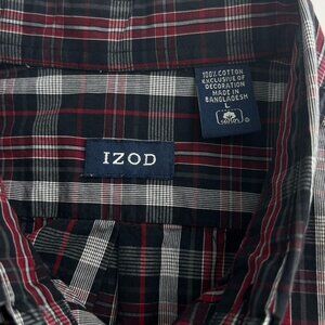 Izod's long sleeve, plaid shirt in size L offers a stylish and comfortable fit for men. Its red and black color scheme, button-up design, collared, and paired with 100% cotton material, enhance its casual yet classy appeal.