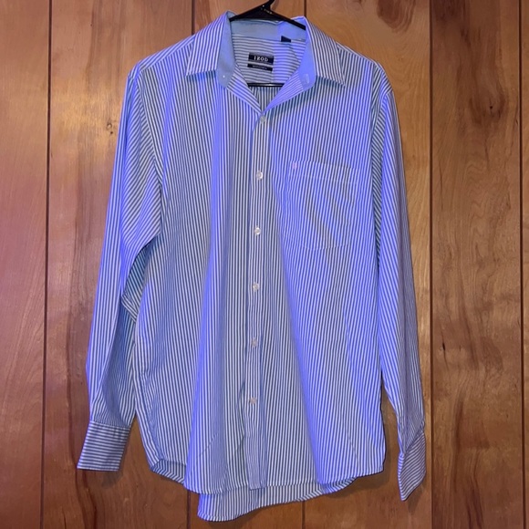 Excellent used condition IZOD mens classic button down shirt. No flaws of any kind. Colors are light blue and white striped. Has pink IZOD logo on front pocket. Very nice shirt!!