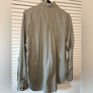This Izod men’s long sleeve button down shirt has a subtle houndstooth design in muted green and cream colors. Excellent condition. Made of 100% cotton. Size large; check measurements below for fit. Machine washable.