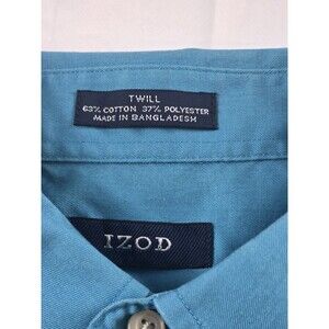 The Izod Men's Large 17 34/35 Teal Regular Fit Long Sleeve Button Up Shirt is a classic and versatile dress shirt suitable for various occasions such as parties, weddings, and casual wear. Made from a blend of polyester and cotton poly, this shirt features a collared neckline, button-down collar style, and long sleeves for a polished look. With a solid blue color and a chest size of 18 inches pit to pit, this shirt is machine washable and easy to care for. The regular fit and basic style make it a timeless addition to any man's wardrobe.