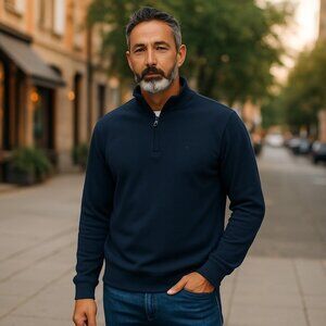 This Izod men's pullover sweatshirt offers a blend of comfort and style with its cotton-polyester composition. The navy blue shade provides a versatile and professional look, suitable for casual outings or relaxed office settings. The 1/4 zip design adds convenience, allowing for easy wear and adjustable comfort.