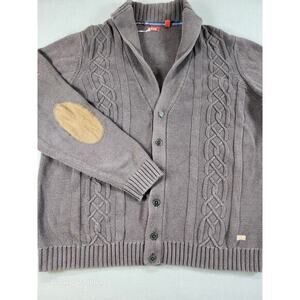 Izod Mens Sweater Cardigan XL Brown Elbow Patches Cableknit Fisherman Grandpa