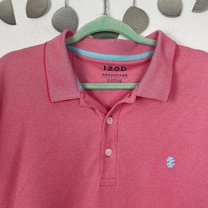 This is a pink short sleeve causal polo shirt from Izod's Advanced Performance line. It has some stretch and is breathable.
