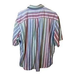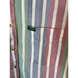 1 Pre-owned Izod Mens XL Striped Short Sleeve Button Up Shirt with front pocket and logo embroidery.