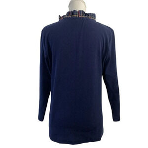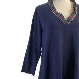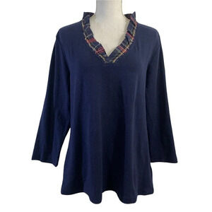 Izod Navy Knit Top Plaid Ruffle Trim Large 3/4 Sleeve Navy Blue Red Yellow Green