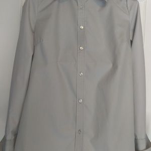 New gray long sleeve no iron Izod blouse. Never worn. Wide cuff taylored sleeves, six button, size medium. Cotton and polyester blend.