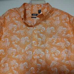 Izod stretch poplin short sleeve button down shirt men's XL. It is orange with lobsters 24 inches across and 30 inches long great condition worn 1 time.