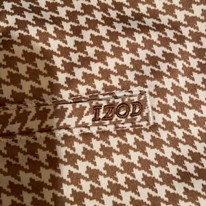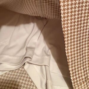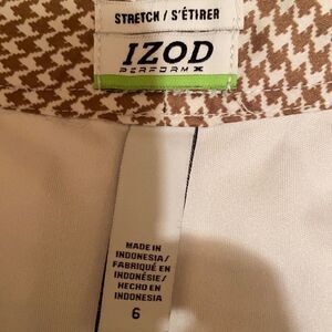 Izod perform X stretch Skort has pockets, name on button and logo, tan and white houndstooth print