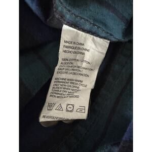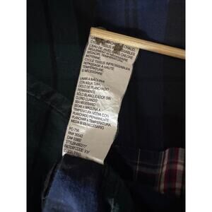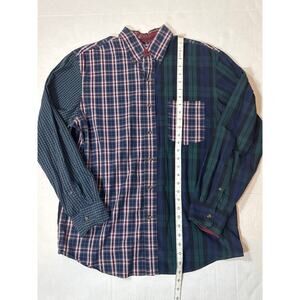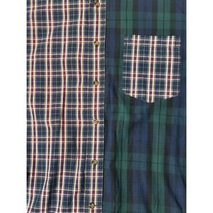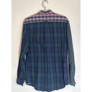 Mixed patchwork plaid button up fun shirt. Multicolor forest green, dark navy blue, burgundy red and white. 100% cotton. Machine washable. Great preowned condition with light signs of wear. Professional, highly rated seller, quick shipper, open to offers!