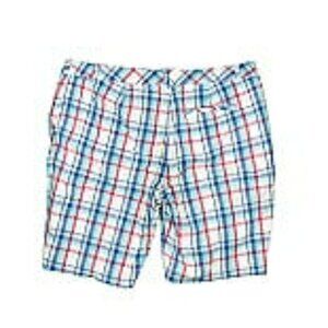 97% cotton, 3% spandex Plaid print, blue, red, white, mid rise waist Size 12 Measured at 10" inseam, 38.5" waist, 10.25" rise (approx.)