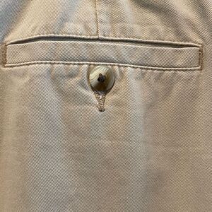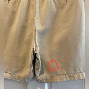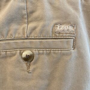 Izod men’s pleated front Khaki (tan/beige) shorts with 4 pockets (two front and two bottom pockets in back) and a working zipper fly. Small scratch on material on back right leg (see pics). Barely noticeable and does not puncture surface. Two extra buttons. Smoke free, dog friendly home.