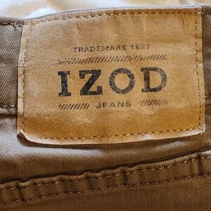 These Izod Relaxed Fit Jeans are a comfortable and versatile pair of pants, made from 98% cotton and 2% spandex, offering a slight stretch for added comfort. The pants feature a unique brown/tan striated color. The front includes a traditional five-pocket design while the back showcases buttoned flap pockets, along with an Izod Jeans leather patch on the waistband, emphasizing the brand’s heritage. These jeans are designed for a relaxed, straight-leg fit, making them ideal for casual wear or workwear.