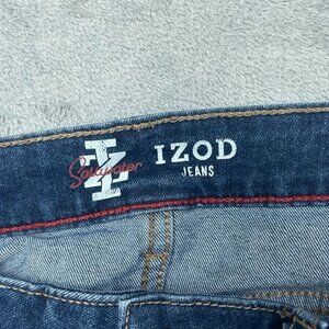 These jeans feature a straight-fit cut, comfort-stretch material, and a classic blue denim finish. Tag details note a Saltwater design by Izod, perfect for casual wardrobe versatility.