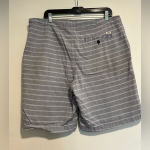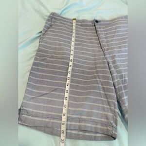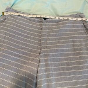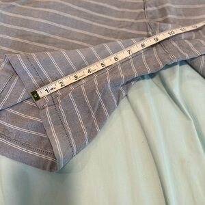 Izod Saltwater Mens 36 Flat Front Bermuda Chino Shorts Blue And White Stripes. Slash pockets. Double rear button pockets. 9.5 inch inseam. Lightweight, breathable. Linen appearance. Excellent used condition. No rips, stains or defects. Please see pictures for measurements.