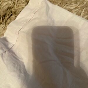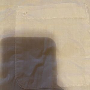 Shirt is in excellent condition, lightweight material. Color looks white with a shade of light pink. one of the buttons has black thread, I’m just not sure if it was a fix or if it came like that. See pictures