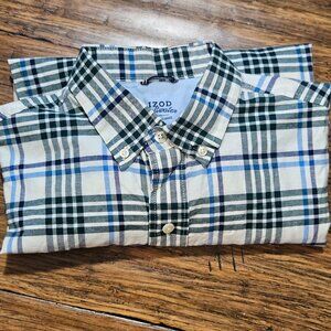 Small Izod Saltwater Oxford Shirt Relaxed Classics Cotton Blue Green Plaid Made in Egypt. In great pre-owned condition. No stains, tears, signs of wear even on the cuffs and collar. Bottom button appears to have be reattached with black thread.