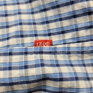 Izod Short Sleeve Button Down Mens Shirt Blue and White Size XL. The shirt is in good pre-owned condition. No obvious flaws but the inside label is worn. The model wears a size Large in most brands.