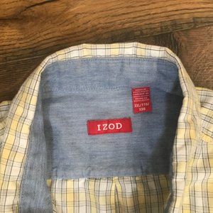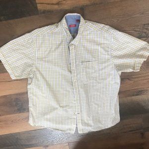 Quality Men's well-made Business Casual, Classroom or Resortwear button down. It has the locker loop detail on the back for hanging at the gym. The base of the shirt is white with yellow and blue checkerboard. Light blue jean colored details. The shirt is in great shape.