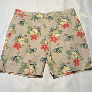This is new with tags. The color is tan and floral. 98 % cotton, 2 % elastane. Zip fly. 9.5 inch inseam.