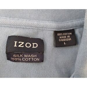 Mens blue polo shirt from Izod. Silk wash, 100% cotton. Size L. Tiny mark on the front right.