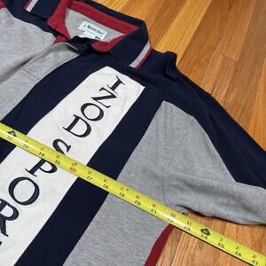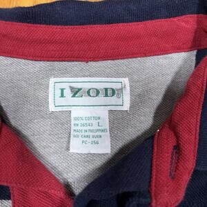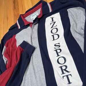 Izod Sport VTG Rugby Shirt Large Blue Red Gray Polo Logo Spellout Long Sleeve