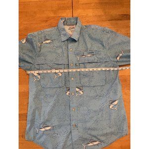 This Izod Surfcaster Blue Print Short Sleeve Button Up Shirt in Medium size is perfect for the fishing enthusiast. It features a collared neckline and button closure, with a breathable cotton blend material that makes it comfortable to wear during long fishing trips. The shirt also has pockets, making it easy to store small fishing accessories.