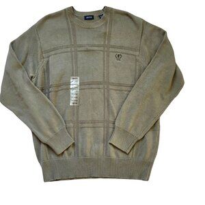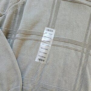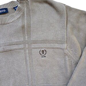 Izod sweater, men’s pullover, olive knit, crew neck, textured grid pattern, cotton blend, casual classic sweater, neutral tone, preppy style, fall winter fashion, cabincore, cottagecore