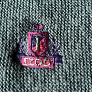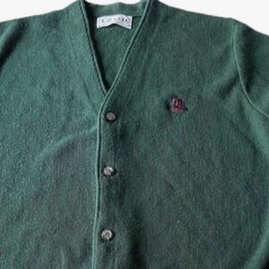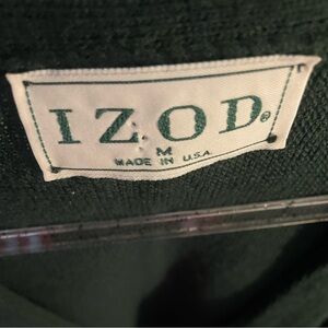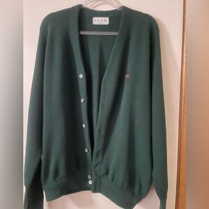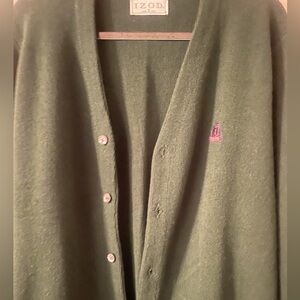 Classic retro Izod cardigan in dark green. Features button-up front with silver metallic Izod buttons. Cardigan reflects the preppy Izod logo & style.