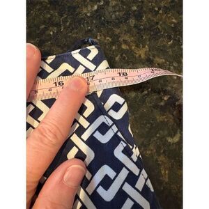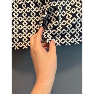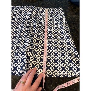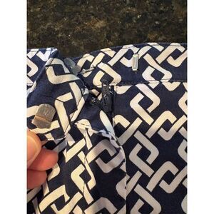 The Izod skort in size Standard 10 is a versatile piece for women, featuring a geometric pattern in multicolor with a focus on White and navy. Made from a blend of cotton and spandex, it offers comfort and flexibility. The skort has a short skirt length with built-in shorts and a zip closure, making it suitable for casual occasions such as golf or tennis. It is designed for all seasons and is machine washable for easy care. The item is pre-owned with light wear.