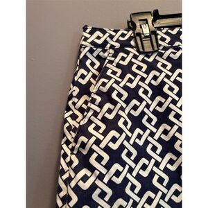 The Izod skort in size Standard 10 is a versatile piece for women, featuring a geometric pattern in multicolor with a focus on White and navy. Made from a blend of cotton and spandex, it offers comfort and flexibility. The skort has a short skirt length with built-in shorts and a zip closure, making it suitable for casual occasions such as golf or tennis. It is designed for all seasons and is machine washable for easy care. The item is pre-owned with light wear.