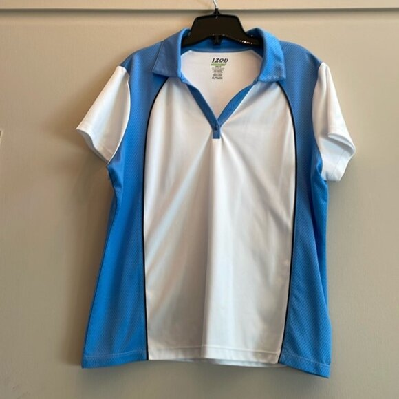 Izod blue and white v-necked golf shirt with snap detail. EUC. Size XL.