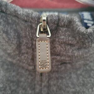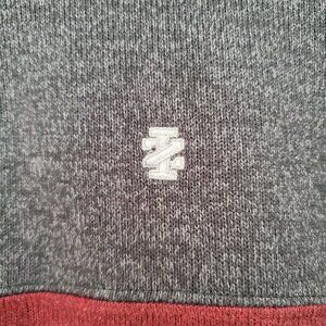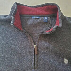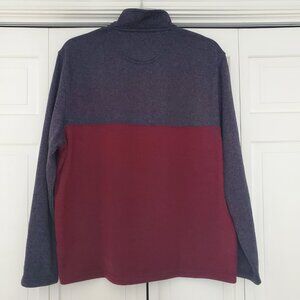 Like new! Izod pullover has a color-block design with a dark gray upper half and sleeves, and a maroon lower half. It features a quarter-zip closure at the neck and the Izod logo embroidered on the left chest.