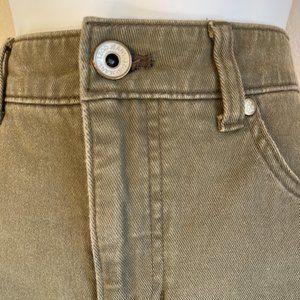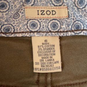 Izod olive green denim mini skirt in size 6 with flex stretch fabric and a comfort inner waistband. Excellent used condition with no flaws found. Features front and back pockets, zip fly with button closure, and classic denim styling.