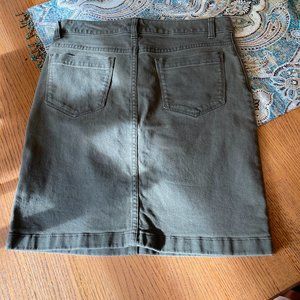 Izod skirt, olive denim skirt, green mini skirt, flex waistband, women’s denim skirt, stretch mini, classic style, everyday casual skirt, LaLa Go closet