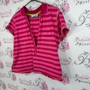 Vibrant fuchsia and pink striped top. Features a classic collar and buttoned front. Xl.