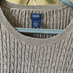 Izod grey cable stitch sweater in excellent condition no snags or flaws. This sweater has buttons on the sleeve and a scalloped edge to the sleeve and bottom of the sweater giving it a feminine edge.
