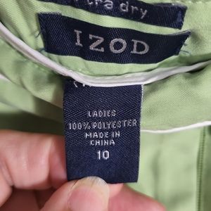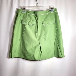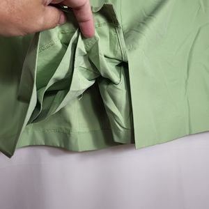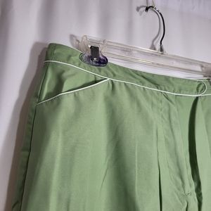 Mint green linen skort with front side pockets and a touch of white piping trim at pockets and waist, also has back pockets, front zipper, women's 10