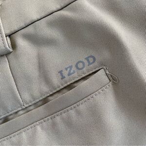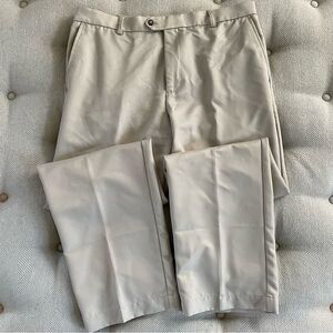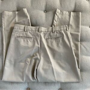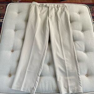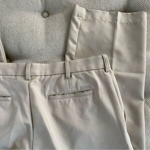 I said men’s 100% polyester khaki flat front pants with pockets and button and zip closure. Measurements are approximate and taken while laying flat: 18.5 inches straight across the waist, 13 inch rise and 31 inch inseam. Please note that the tag size is 32 inch inseam, however the true measurement is a 31 inch inseam