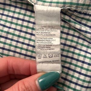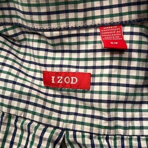 Stay sharp in this men's button-up shirt from Izod. Boasting a timeless blue green white plaid color palette, it's designed with a single chest pocket, classic collar, long sleeves, and a curved hem. It's essential for every man's wardrobe that offers both style and functionality.