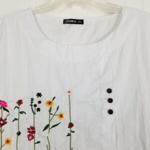 Izuria White Short Sleeve Pop Over Top Shirt Embroidered Flowers Button Size 2XL