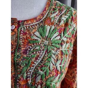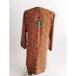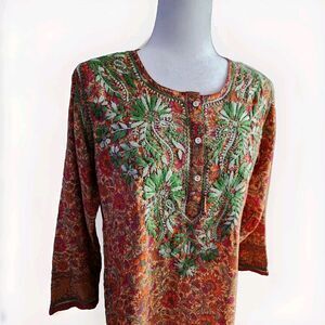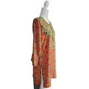 Izzband Women's Floral Silk 3/4 Sleeves Tunic Top Hand Embroidered Side Slit S