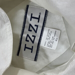 This is an Izzi Mountain Parka in white, size Large for women. It features long sleeves, a drawstring closure, and a hood. The parka has a mid-length design with a button-up front and is suitable for travel and workwear. Made of polyester insulation and nylon lining, it is machine washable. Ideal for winter, fall, and spring seasons.