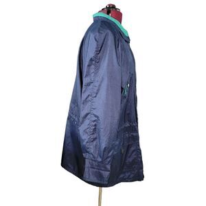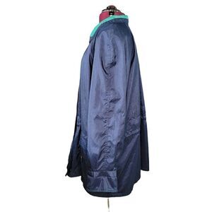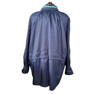 Navy blue and green windbreaker, button and hidden zip front jacket closure, large square pockets, drawstring waistband, great condition with minor vintage wear, water resistant, lightweight and comfortable. Please see photos for details on condition.