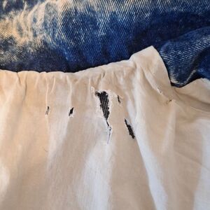 Very cool vintage acid/stone washed denim coat! 1980s, early 90s. Genuine leather accents on shoulders and back. Zip up with additional toggle button closure, pockets, dolman sleeves, corduroy collar. There are a few condition issues... distressing along hem( i think adds character to the vintage look) The zipper needs to be stitched at the bottom, easy fix. A few small holes in the lining (pictured) and one pocket has a small hole on the inside. Cool coat! No size tag but fits like a L/XL 24" pit to pit 40" long