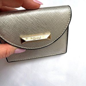 Izzy & Ali small silver key chain wallet 4,1/4"X4,5",1", Gold color hardware Interior includes (1) zip pocket, (1) main comparment, (1) card slot, 1 open outer pocket, logo lining, selected vegan leather goes through testing for CA prop 65 compliance.Grate condition - never worn, but there is some peelling inside see last 2 pic