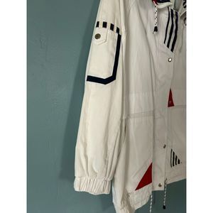 Izzy Spirit women's zipper & snap lined white nautical jacket size medium with red and blue trim and lightly padded shoulders. Material cotton/poly blend with nylon lining. Measures 25" across chest, 15" armpit to cuff, 31.5" length.
