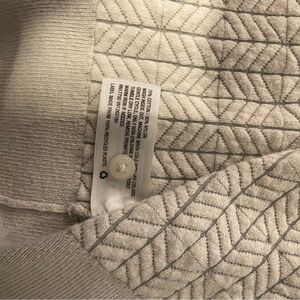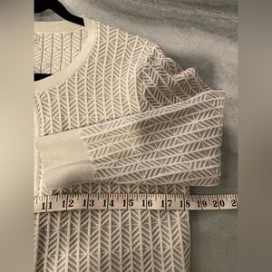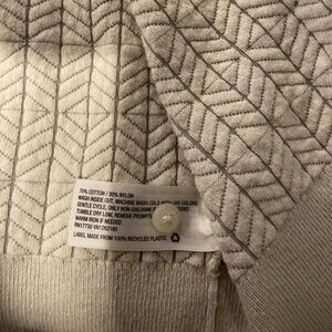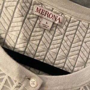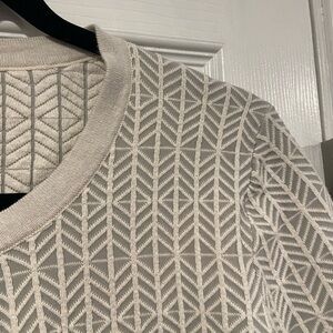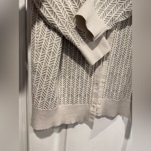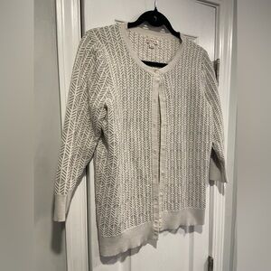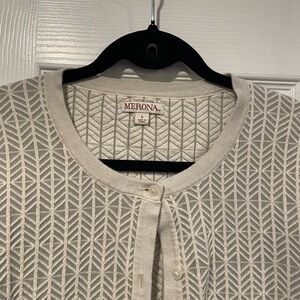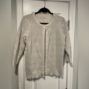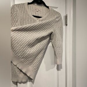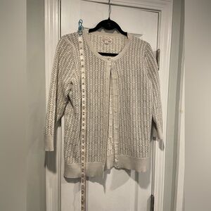 Gray cream cotton nylon stretch textured knit 3/4 sleeve crew neck button front lightweight cardigan sweater