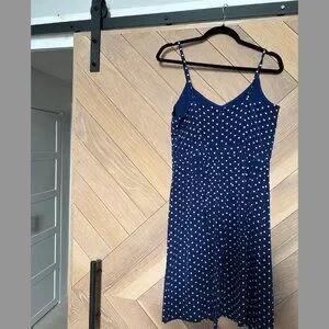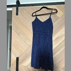jcrew • j crew dress • polka dot dress • navy dress • midi dress • summer dress • casual dress • classic style • preppy outfit • size 4 • timeless style • spaghetti strap dress • vintage-inspired • dotted dress • chic casual look • brunch outfit • vacation dress • feminine fashion • everyday dress