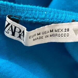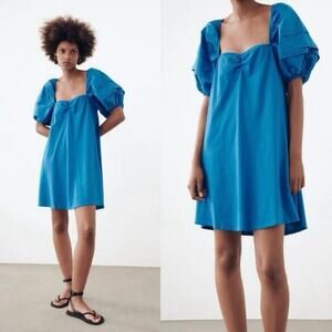 ZARA Blue Puff Sleeve Cotton Mini Tunic Dress Size Medium Preppy Boho Tie Back Elastic Upper Hem Coastal Summer