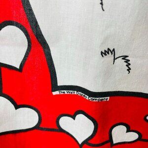 This vintage 80s Disney bandanna, produced by J A Woronowicz, features an adorable design of Mickey Mouse gifting Minnie Mouse flowers. The red polyester scarf is perfect for Disney enthusiasts.